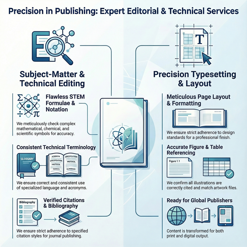 We offer accurate, reliable handling of complex scientific, technical, and academic manuscripts. Unlike generalist editing services, our specialist teams are trained in specific disciplines (Physics, Medicine, Law, etc.), enabling them to spot not just linguistic errors, but also technical inconsistencies, flawed notation, or incomplete references. Our expertise enhances your content’s authority and trustworthiness, significantly reducing the need for costly author revisions and time-consuming subject-matter expert review.
